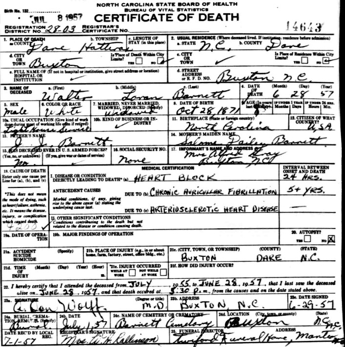 | Barnett, Gertrude | w | f | 2 | daughter | s | no | NC | NC | NC | Death Cert, Dare Co., b. Dec 4, 1877, Beaufort, NC, d. Sept 4, 1939; widow of Humphreys Lewark | |||