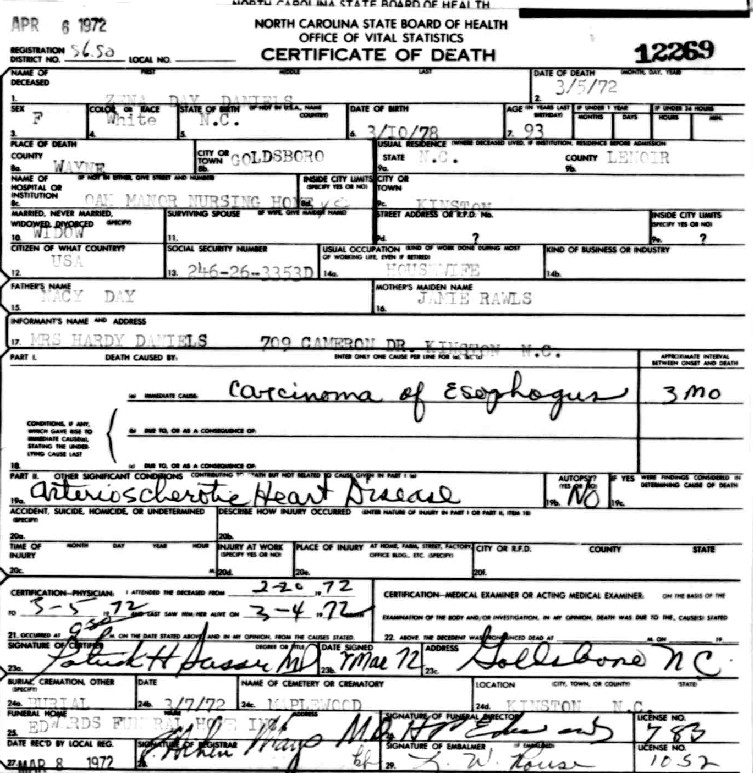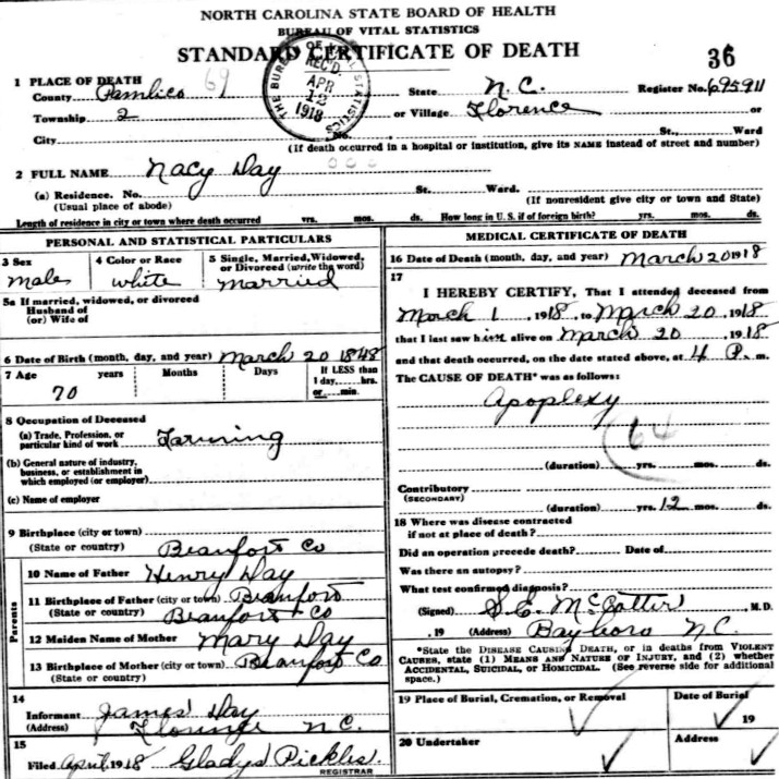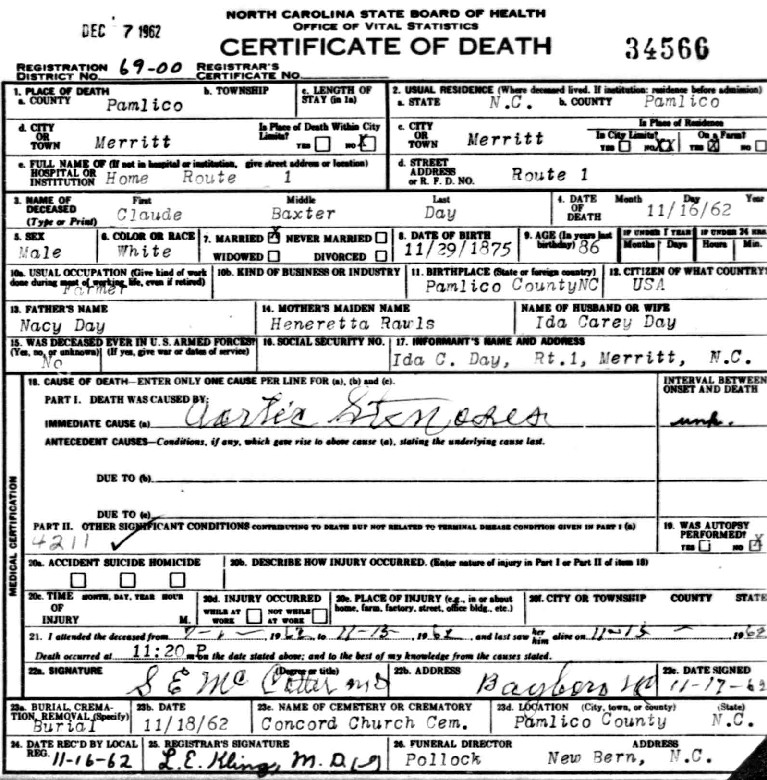 | Day, Claudious B. | w | m | 4 | son | s | no | NC | NC | NC | Death Certificate | |||