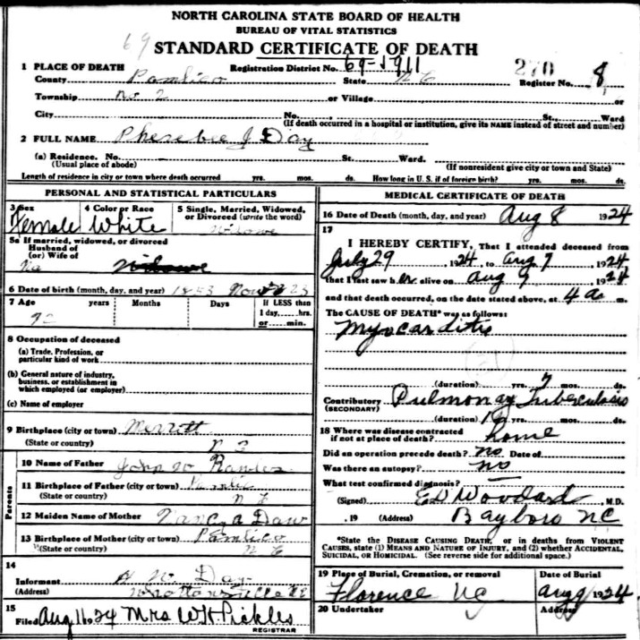 | Day, Ferebee J. | w | f | 26 | wife | m | Keeping house | no | NC | NC | NC | Death Certificate | ||