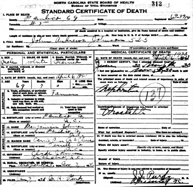 | Johnson, John A. | w | m | 19 | son | s | Works on farm | yes/no | NC | NC | NC | Death Certificate | ||