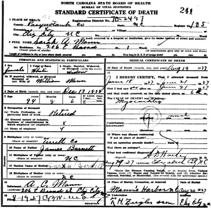 | Mann, Sarah | w | f | 43 | wife | m | Keeping house | NC | NC | NC | Death Certificate; Tombstone | |||