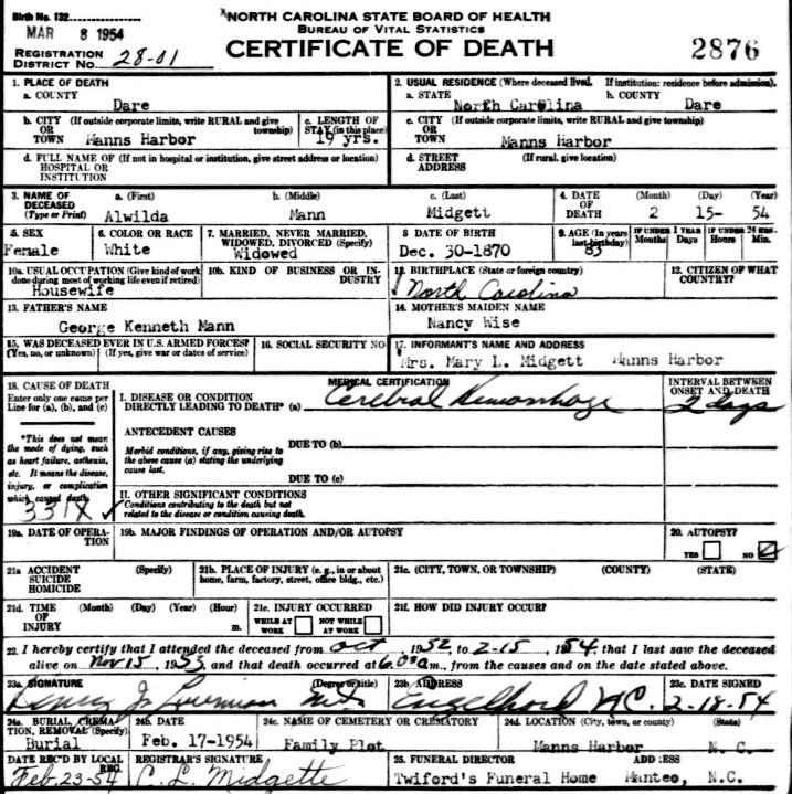 | Mann, Alwilda | w | f | 10 | daughter | s | no | NC | NC | NC | Death Certificate; Tombstone | |||