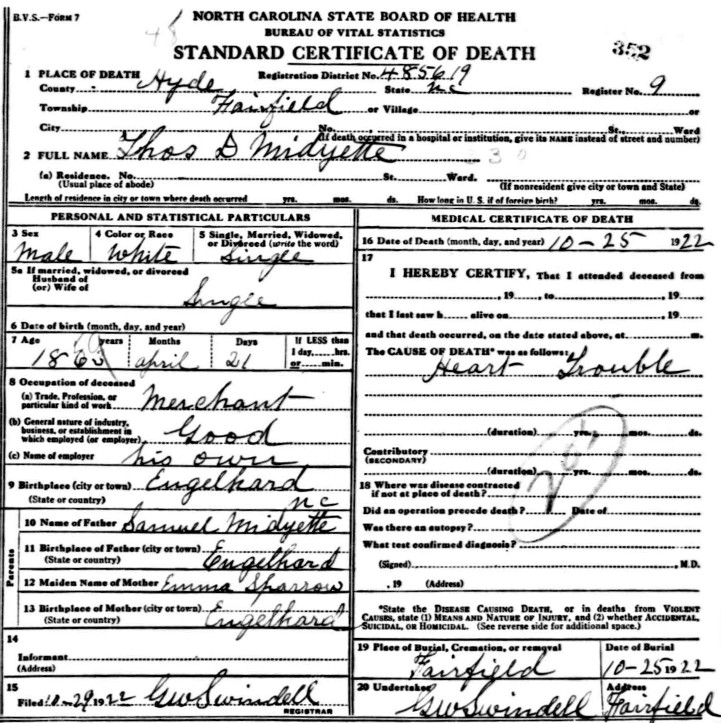 | Midyett, Thomas L. | w | m | 16 | brother | s | Works on farm | yes/no | NC | NC | NC | Death Certificate | ||