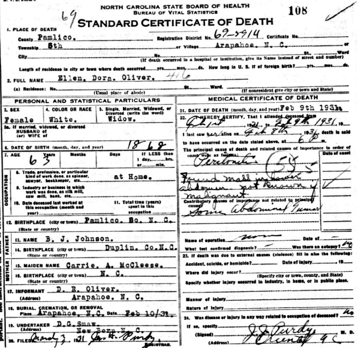 | Johnson, Ellen L. | w | f | 11 | s | NC | NC | NC | Death Certificate |