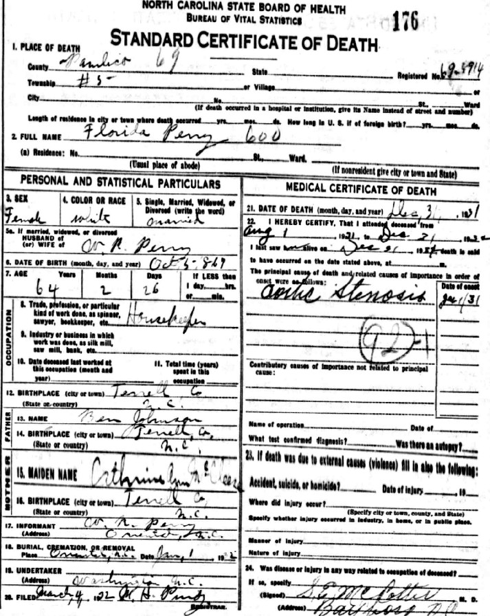 | Johnson, Flarida E. | w | f | 13 | daughter | s | At school | NC | NC | NC | Death Certificate | |||
