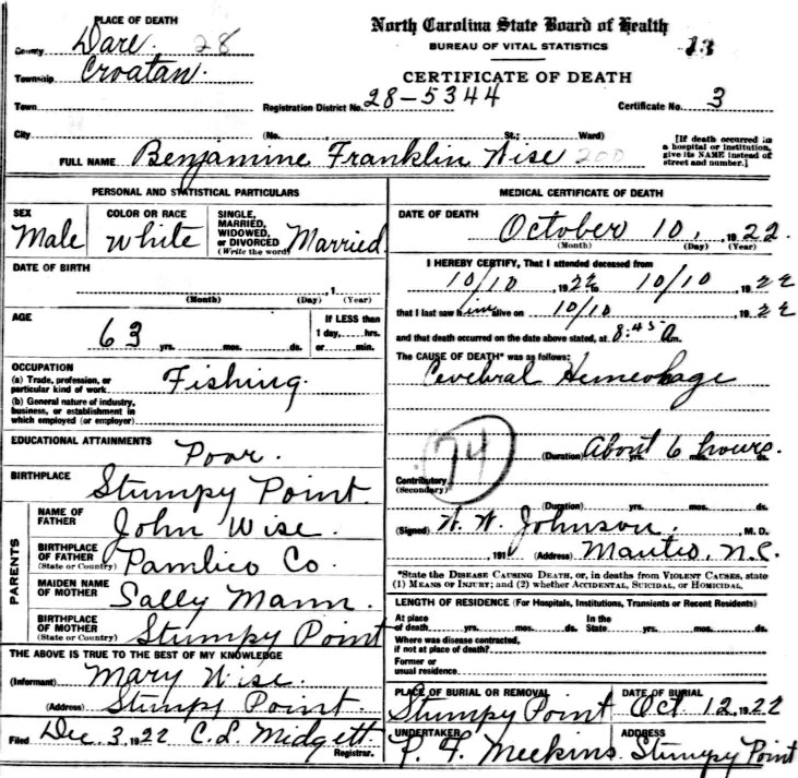 | 126 | 129 | Wise, Benjamin F. or H. | w | m | 22 | son | w | Farmer | NC | NC | NC | Death Certificate; Cemetery Listing | |