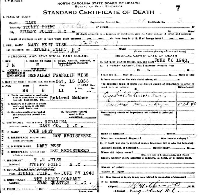 | Wise, Mary | w | f | 25 | wife | m | Keeping house | no | NC | NC | NC | Death Certificate; Cemetery Listing | ||