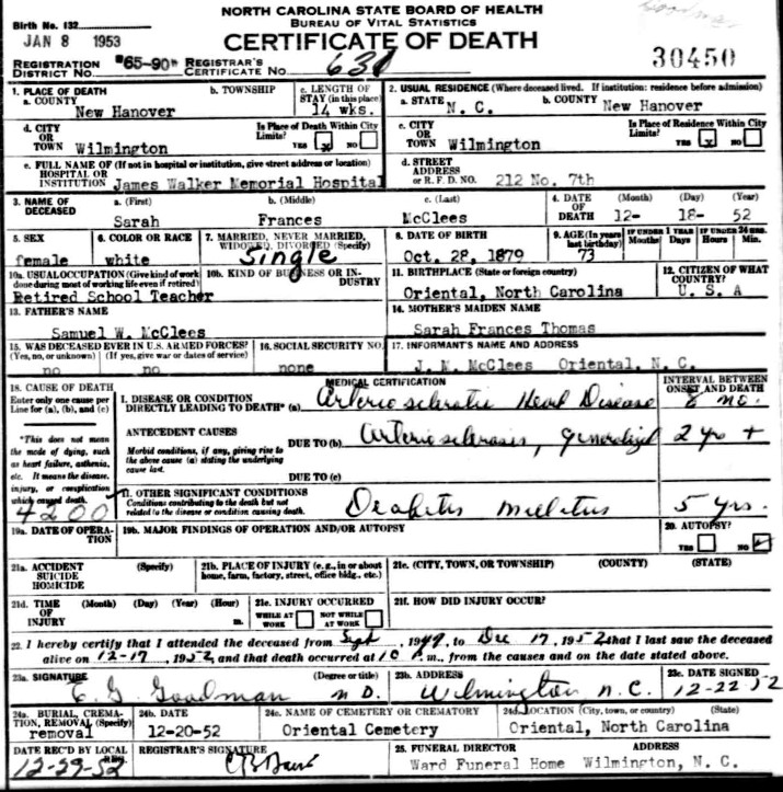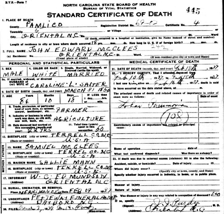 | McClees, John E. | w | m | 30 | brother | w | Farmer | NC | NC | NC | Death Certificate | |||