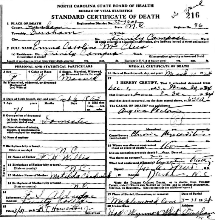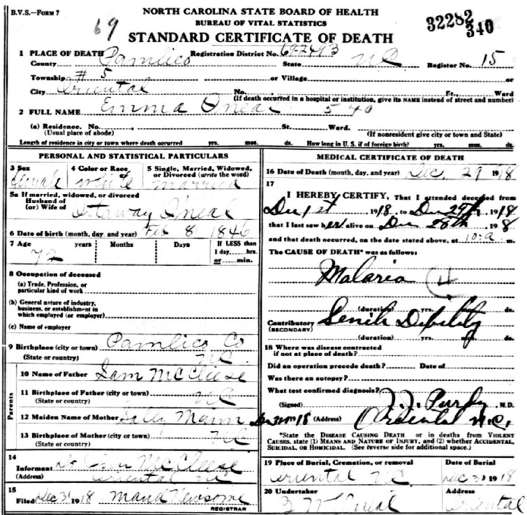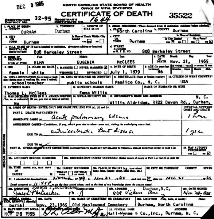 | McClees, Emma C. | w | f | 26 | wife | m | Keeping house | NC | NC | NC | Death Certificate | |||