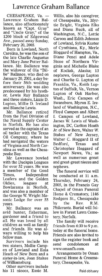 LOWLAND - Dave Taylor Ballance, 81, of 5404 Lowland Road died Monday at Craven Regional Medical Center. Graveside service will be at 2 p.m. Thursday at Lowland Community Cemetery with Jessie Foreman officiating. He is survived by one son, Calvin Ballance of Chesapeake, Va.; three daughters, Janice Ireland of Aurora, Gloria Nanney of Chesapeake, Va., and Patsy Leary of Chesapeake, Va.; one brother, Foy Ballance of Everglades, Fla.; two sisters, Helen Fields of Portsmouth, Va., and Mamie Twiford of Lowland; 16 grandchildren; and 32 great-grandchildren; and two great-great-grandchildren. Arrangements by Bryant Funeral Home, Alliance. (Sun Journal [New Bern, NC] - 2002?)