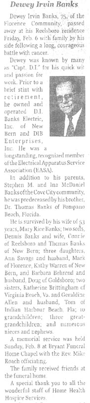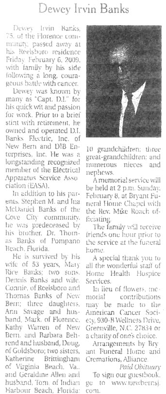 Johnnie Wayne Banks, 57, of the Goose Creek community, died Tuesday, March 17, 2009, at home. He was a life-long commercial fisherman, devoted husband, loving father and grandfather and friend to all who knew him. He was preceded in death by his parents, Frank and Kathryn Banks, and a sister, Diane Banks Whitfield. He is survived by his wife, Julie Banks; two sons, Douglas Wayne Banks and wife, Amanda; and children, Austin Wayne, Auburn Nicole, and Katherine Elizabeth of New Bern and David Banks and wife, Ashley, and child, Riley Michelle, of New Bern; one brother, Charles Banks of Stonewall; and one sister, Faye Dixon of Goose Creek. A funeral service will be held at 2 p.m. Saturday, March 21, at New Life Praise and Worship Church with the Rev. Blaney Rowe, the Rev. Richard Roberts and the Rev. McDonald Bennett officiating. Burial will follow in Cayton Cemetery in Goose Creek Community. The family will receive friends from 7 to 8 p.m. Friday night at the church. Arrangements by Bryant Funeral Home and Cremations, Alliance. (Sun Journal [New Bern, NC] – Friday, March 20, 2009)