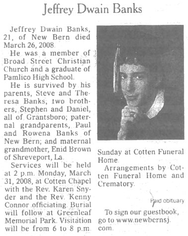 NEW BERN - Emma Florene Jarvis Banks, 50, of 7A Arlington Circle, died Thursday, Oct. 14, 2010, at CarolinaEast Medical Center. She was a member of Mt. Olive M.B. Church and was employed in the Home Care Industry with Mesic Headstart and In Home Child Care. Her graveside service will be at noon, Monday at Mesic Memorial Cemetery with the Rev. Tony Credle officiating. She is survived by her son, Eugene Banks of New Bern; two daughters, Larissa Hawkins of New Bern and Eugenia Clark of Richmond, Va.; her father and stepmother, Fred and Hattie Davis of Oriental; five brothers, Craig Jones of Oriental, Major Roosevelt Dudley of Bayboro, Melvin Leon Dudley Jr. of New Bern, Leon Jones of Raleigh, and Fred Davis Jr. of Cheverly, Md.; sisters, Kathy Dudley Adams of Vanceboro, Gail Dudley of New Bern, Patricia Davis of Washington, D.C., and Dashay Jones of Vandemere; eight grandchildren; maternal grandmother, Alice Parker of Mesic; paternal grandfather, Wesley Davis of Alliance; and step-grandmother, Lovie Smith of Oriental. The family will greet friends Monday at Mesic Memorial Cemetery. Arrangements are by Oscar's Mortuary Inc. (Sun Journal [New Bern, NC] - October 19, 2010)Jeffrey Dwain Banks