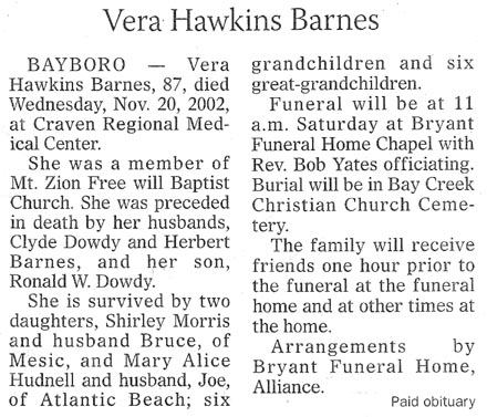 VANDEMERE - Hugh Hudson Barnes Jr., 74, died Thursday, Jan. 26, 2012, at home. He was an avid gardener. He is survived by his wife, Rachel Lewis Barnes; one son, Hugh Barnes of Goose Creek; one daughter, Terri B. Smith of Supply; 11 grandchildren; and three great-grandchildren. His funeral will be held 11 a.m., Saturday, Jan. 28, at Mt. Zion Original Free Will Baptist Church, Cash Corner, with the Rev. Owen Peele and the Rev. Dale Delvin officiating. Interment will follow immediately in Celestial Memorial Gardens, Cash Corner. The family will receive friends and relatives one hour prior to the service at the church. Arrangements are by Bryant Funeral Home & Crematory, Alliance. (Sun Journal [New Bern, NC] – Saturday, January 28, 2012)Ila Carawan Barnes