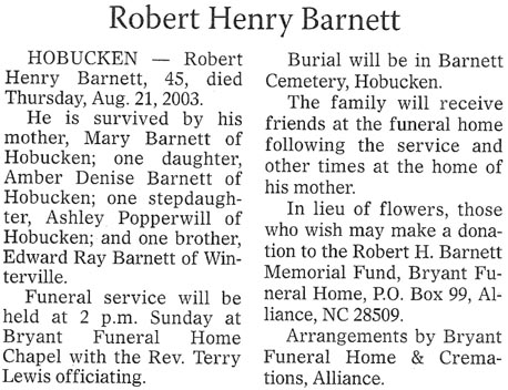 Francis "Mike" Michael Barnes, 50, of Bayboro, died Wednesday, March 25, 2009, at home. He was a member of Mt. Zion Free Will Baptist Church. He is survived by his wife, Shirley M. Barnes; three sons, Michael Dale Barnes, Hudson Lee Barnes and Nicholas Shane Barnes, all of the home; parents, Hugh Jr. and Rachel Barnes of Bayboro; one brother, Hugh H. Barnes III of Goose Creek; and one sister, Teresa Lynn Smith of Holden Beach. A funeral service will be held at 2 p.m., Friday, March 27, at Mt. Zion Free Will Baptist Church, with the Rev. John Mark Windley officiating. Burial will follow in Celestial Memorial Gardens. The family will receive friends from 12:30 to 2 p.m., prior to the service at the church. Arrangements are by Bryant Funeral Home & Cremations, Alliance. (Sun Journal [New Bern, NC] – Saturday, March 28, 2009)