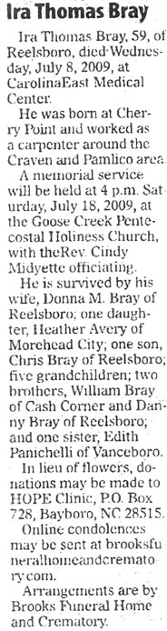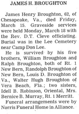 Dan H. Boone, 72, of Bayview Nursing Home, formerly of Chapel Hill, died Sunday, Aug. 16, at Carolina East Medical Center. He is survived by two daughters: Sarah Boone of Mebane and Emily Boone of Richmond, Va.; one brother, Charles Boone of Oriental; and one sister, Beth Boone of Kinston. Arrangements by Bryant Funeral Home & Cremations, Alliance. (The Pamlico News [Oriental, NC] - Wednesday, August 19, 2009) Kindly submitted by Shirley Gabbert.