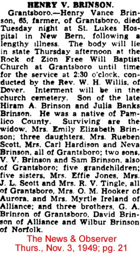 Mr. Hilton E. Boyd, 85, died Sunday, January 31, 2010 at his home. A memorial service was held February 4 at Hooker Memorial Christian Church. Burial will be private. Mr. Boyd was preceded in death by his wife, Elizabeth Simpkins “Betty” Boyd in 2007. He is survived by his daughters, Sonya Boyd Fox and Elizabeth Boyd McGlauflin and grandchildren, Elli McGlauflin, Kristin McGlauflin, and Sarah E. Fox. The family received friends immediately after the service at the church. (The Pamlico News [Oriental, NC] – Feb. 10, 2010) Submitted by Shirley Gabbert.