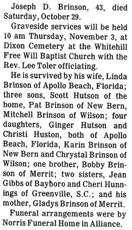 ARAPAHOE - Ernest "Bobcat" Boomer, 62, a native of Arapahoe, died Saturday, Nov. 13, 2010, at Carebridge Assisted Living Center in New Bern. Ernest was a lifetime member of Piney Grove Disciples of Christ Church. He is survived by one brother Arthur Boomer of Kinston; eight sisters, Emma Holton, Sarah Hackney, Mavis Nelson, Shirley Boomer, Isabelle Blango and Gladys Boomer, all of Arapahoe, Atlie Mae Richardson of Grantsboro and Leatha Johnson of Oriental. Memorial services will be conducted at 2 p.m. on Wednesday, Nov. 17, 2010, at Piney Grove Disciples of Christ Church, with the Rev. Lester Mitchell officiating. Interment will follow in the Piney Grove Disciples of Christ Church Cemetery. The family will receive friends at the residence of Isabelle Blango, 1616 Don Lee Road, Arapahoe. Viewing will be at Oscar's Mortuary from 11 a.m.-6 p.m. on Tuesday. (Sun Journal [New Bern, NC] – Wednesday, November 17, 2010)Lawrence Boomer