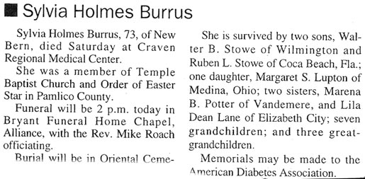 Stella Willis Burroughs, 80, of Grantsboro died Monday, February 18, 2013, at her home. She took great pride in her family and in being called “Mom”. Children adored her and she was an excellent seamstress, an avid UNC fan, and enjoyed genealogy. She was preceded in death by her husband, John Luther Burroughs. She is survived by two daughters, Delores B. Townsend of Grantsboro and Johnette B. Jones of Reelsboro; three grandchildren, Jonathon Brinson, Lori Altman and Nathaniel Jones; and seven great-grandchildren. A funeral service will be held 11:00 a.m., Wednesday, February 20, at New Bethlehem Original Free Will Baptist Church with the Rev. Jesse Crisp, the Rev. Graham Lane and the Rev. Grady Burroughs officiating. Interment will follow immediately in the church cemetery. The family will receive friends and relatives from 6:30 to 8:00 p.m., Tuesday evening at Bryant Funeral Home. (Bryant Funeral Home)
