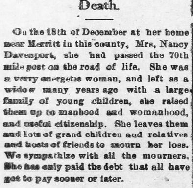 Nellie Whorton Davenport, 84, of Plant City, died Thursday (Sept. 23, 1999) at home. Born in Whortonville, N.C., she came here in 1941 from Atlanta. She was a homemaker. She was a member of the Woman's Club of Plant City, the E.C.W and the Alter Guild. She was a member of St. Peter's Episcopal Church. Survivors include a brother, Riley Whorton, Glen Arm, Md. Wells Memorial Funeral Home, Plant City. (St. Petersburg Times [St. Petersburg, FL] - September 26, 1999; pg. B7)