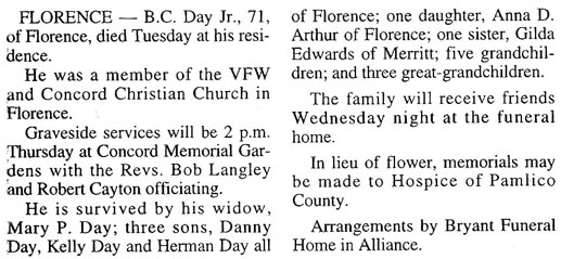 Joseph "Joe" Bryan Daw, 46, of Arapahoe died, Friday, July 25, 2008 at Craven Regional Medical Center. He was a loving husband, wonderful son, and great friend and will be missed by all. He is survived by his wife, Tammy Ensley Daw; mother, Dorothy Baker of Vanceboro; father, Elbert Daw and stepmother, Billie of Arapahoe; in-laws Roger and Shirley Ens-ley of Arapahoe; two stepbrothers, Butch and Will Baker both of Burlington; one step-sister, Robin Roberts of Arapahoe; two nieces and two nephews. Funeral services will be held at 3 p.m. Monday, July 28th at Bryant Funeral Home Chapel with the Rev. Dwayne Boyd officiating. Interment will follow immediately in Paul Cemetery, Arapahoe. The family will receive friends one hour prior to the service at the funeral home. Arrangements by Bryant Funeral Home and Cremations, Alliance. (The Sun Journal [New Bern, NC] – Wednesday, July 30, 2008)