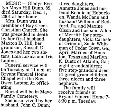 BAYBORO – John C. Dunn, 76, died Sunday, February 8 at Craven Regional Medical Center. He was a charter member of the Pamlico County Moose Lodge. He was preceded in death by his wife, Evelyn. He is survived by four daughters, Vicki Carlisle of Oriental, Susan Dunn Whitman of Carrollton, GA, Marilyn Kyde Dietz of DeCatur, GA and April Mireles of Houston, TX; two sisters, Mary Bennett of Stonewall and Bonnie May of Nashville, NC; five grandchildren; five great-grandchildren; and his beloved friend, Rosa White of Merritt. A memorial service will be held Wednesday, February 11 at 2:00 pm at Bryant Funeral Home Chapel with the Rev. Richard Baldwin officiating and rites by the Pamlico County Moose Lodge. A private burial will be in Sandhill Cemetery. The family will receive friends at Bryant Funeral Home from 1:00 pm until 2:00 pm on Wednesday just prior to the service and other times at the home of Maxine Banks, 68 Spain Farm Road in Stonewall. Arrangements by Bryant Funeral Home and Cremations of Alliance. (The Pamlico News [Oriental, NC] - February 2004)