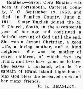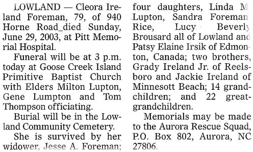 Dorcas Elizabeth "Libby" Foreman, 75, died July 13, 2004, at her home. She was preceded in death by two brothers, Prince Lewis and Dalton Lewis. Surviving are her husband, James Foreman; two sons, Franklin Foreman and wife, Brenda of Suffolk and Larry Foreman and wife, Beth of Lowland; a daughter, Peggy Ross of Lowland; two brothers, Harold Lewis and Michael Lewis, both of Lowland; four sisters, Mae Belle Carawan of Aurora, Julia Potter of Bayboro, Marilyn Murphy and Victoria Paul, both of Alliance; two grandchildren, Brent Foreman and Tara Burkett; and six great-grandchildren. A graveside service will be held at 11 a.m. Thursday at Lowland Community Cemetery with the Rev. Phillip Lewis and the Rev. Terry Lewis officiating. In lieu of flowers, memorials may be made to Hospice of Pamlico County, P.O. Box 959, Bayboro, NC 28515 or to the Lowland Pentecostal Holiness Church Building Fund, P.O. Box 82, Lowland, NC 28552. Arrangements by Bryant Funeral Home & Cremations, Alliance. (The Virginian-Pilot [Norfolk, VA] - July 15, 2004; pg. B9)