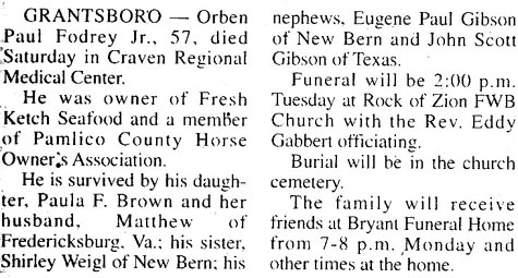 Teddy Vaughn Fodrey, 56, of Pittman Circle, Oriental, N.C., died Friday, July 1, 2005.Due to construction on the First Baptist Church in Oriental, funeral services will be held at the Oriental Free Will Baptist Church 11 a.m. Monday. Reverend Murray Etheridge of the Oriental First Baptist Church and Reverend Harry Bryan of the Croatan Free Will Baptist Church will be officiating. Ted was a native of Pamlico County. Born September 13, 1948, in Mesic, N.C., he was the son of the late Desbor Ray Fodrey and Ruby Dowdy Fodrey. Ted was also predeceased in death by his brother, Ray Francis Fodrey and sister, Paulette Fodrey Stephenson. During his teen years, he worked as a commercial fisherman with his brother-in-law, Harold L. Stephenson. He graduated from the Pamlico County school system and served in the United States Air Force during the Vietnam War from 1968 to 1974. Ted was employed by PCS Phosphate as an instrument mechanic and was medically retired in 1996. Ted was a much loved member of the Oriental community for over 50 years. He taught Sunday School in several of the area churches and was a devoted member of the First Baptist Church in Oriental. Ted was a loving father, husband and uncle and was a devoted friend to many. He is survived by his wife of 31 years, Michelle McKee Fodrey; their two daughters, Mary McKee "Kee" Fodrey and Sarah Wilson Fodrey of Pamlico County; his daughter, Melissa Fodrey Watson and husband Chris Watson; and grandson, Parker of Ayden, N.C. He is also survived by his three nieces and their families: Donna Stephenson Johnson and husband Jimmy Johnson and their children, Hunter, Brinkley and Archer of Washington, N.C.; Darla Stephenson Prescott and husband Tim Prescott and their children Taylor, Blaine and Jordan of Williamston, N.C.; Lori Fodrey Williams and husband Tim Williams and their daughter Haley of New Bern, N.C.; his mother-in-law, Winona Wilson McKee of Selma, Alabama; and an extended family of cousins and in-laws throughout the United States. Visitation will be from 7 to 8 p.m. Sunday at Bryant Funeral Home in Alliance and other times at the home, 102 Pittman Circle, Oriental. Arrangements by Bryant Funeral Home & Cremations, Alliance. (Sun Journal [New Bern, NC] - July 2, 2005)