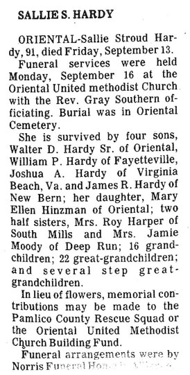 ORIENTAL - Marion Williams Hardy, 85, died Friday, April 14, 2006, at Craven Regional Medical Center. Mrs. Hardy was a member of Oriental United Methodist Church and was a church historian. She was the author of “Oriental: I Remember When,” and “A Glimpse of Pamlico County.” She is survived by her son, John E. Hardy III and wife Linda of Rocky Mount; one daughter, Christine Beeman and husband John of Arapahoe; two brothers, Dalton Williams of Jacksonville and Oliver Williams of Lancaster, Calif.; one sister, Melba Soltow of New Bern; and two grandchildren, Meredith Beeman and Roger Wayne Hardy. She was preceded in death by her husband, John Edward Hardy Jr. Funeral will be 11 a.m. Monday, April 17, 2006, at Oriental United Methodist Church with Rev. Walter Graves officiating. Burial will be in Oriental Cemetery. The family will receive friends at the church one hour before the funeral from 10 to 11 a.m. Arrangements by Bryant Funeral Home & Cremations, Alliance. (Sun Journal [New Bern, NC] - April 15, 2006)