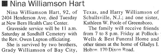 Nettie Bell Whitley Horrell, 82, of 245 S. Fifth St., Apt. 203, Aurora, died Wednesday June 4, 2008, at her home. She was a homemaker and a member of Edward Christian Church. A funeral will be held at 4 p.m. Friday June 6, 2008, at the Edward Christian Church with David Linton officiating. Burial will be in the Edward Christian Church cemetery. She is survived by one daughter, Bell Summerlin of Aurora; two grandchildren; two great-grandchildren; and one sister, Mildred Earp of Spring Hope. The family will receive friends from 7 to 8:30 p.m. Thursday, June 5, 2008, at the Edward Christian Church and other times at the home of her daughter, 245 S. Fifth St., Apt. 202, Aurora. Arrangements by Paul Funeral Home of Washington. (Sun Journal [New Bern, NC] – Thursday, June 5, 2008)