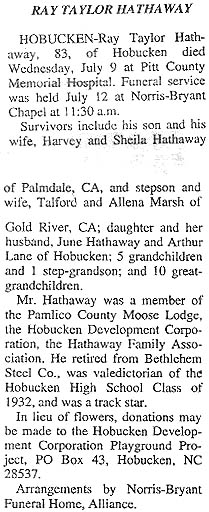 ARAPAHOE - Odessa Blango Hackney, 85, died Sunday, Aug. 3, 2008, at Britthaven of Pamlico. She was a member of Piney Grove Church of Christ Disciples of Christ, where she was a mother of the church and a former choir member. Her funeral will be held at 1 p.m. Friday, Aug. 8, 2008, at Piney Grove Church of Christ Disciples of Christ with the Rev. Farries Slade officiating. Burial will be in Piney Grove Church cemetery. She is survived by four sons, George Hackney Sr., Robert Hackney and Jesse Hackney, all of Arapahoe, and Edward Hackney of Temple, Texas; two daughters, Jennette Nelson and Mary Alice Taylor, both of New Bern; one brother, James Blango of New Bern; one sister, Ruby Blango of Bayboro; 19 grandchildren and 30 great-grandchildren. The family will receive friends at the home of George and Sarah Hackney, 1088 Don Lee Road, Arapahoe. Viewing will be 10 a.m. to 6 p.m., Thursday, at Oscar's Mortuary and one hour prior to the service at the church. Arrangements by Oscar's Mortuary. (Sun Journal [New Bern, NC] – Tuesday, August 5, 2008)