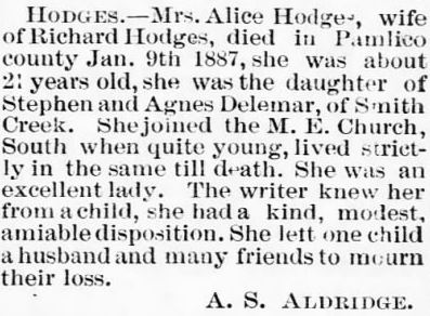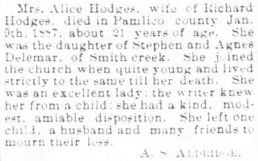 ELIZABETH CITY - Delia Hopkins Houtz, age 96, of Riverwind I, Apartment 105 on Carolina Avenue in Elizabeth City died Friday, October 21 at her residence. A native of Pamlico County, she was a member of Christ Episcopal Church, church woman's auxiliary, NC Museum Association, Elizabeth City Lioness Auxiliary and former member of the Woman's Club and Garden Club. She is survived by a daughter, Nancy Houtz Harris of Elizabeth City; one son, Howard Kennedy Houtz, Jr.; five grandchildren; five great-grandchildren; one sister, Georgia Delamar of Charleston, SC. A memorial service was held Sunday, October 23 at 3 pm at Christ Episcopal Church with the Rev. Fredricka Steenstra officiating. A graveside service followed in Old Hollywood Cemetery. Arrangements by Twiford Funeral Home, Elizabeth City. (The Pamlico News [Oriental, NC] - October 2005)