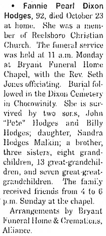 GRANTSBORO - Elsie Dixon Hankins, 77, of 2116 Scott Store Road, died Tuesday, July 1 at Craven Regional Medical Center. A graveside service was held Thursday, July 3, 2 pm, in Pinewood Memorial Park in Greenville with the Rev. Graham Lane officiating. She was a member of New Bethlehem Free Will Baptist Church and a member of the VFW Ladies’ Auxiliary. She is survived by two sons, Jack Hankins of Charlotte and Kenneth Hankins of Brierfield, AL; one daughter, Lana Pat Fink of Sarasota, FL; one sister, Lucille Malone of Grantsboro; seven grandchildren; two great-grandchildren; and long time companion, James Watson of New Bern. Arrangements by Bryant Funeral Home and Cremations in Alliance. (The Pamlico News [Oriental, NC] - July 2003)