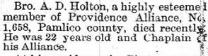 Hilda Ireland Holton, 88, of Grantsboro passed away Thursday, September 3, 2015, at Grantsbrook Nursing & Rehab Center. She was a very kind, loving person and took great pride in staying home to raise her boys then later enjoyed spending time with her grandchildren and great-grandchildren. She was preceded in death by her husband, Alfred Jackson Holton and son, Alfred Jackson Holton, Jr. She is survived by four sons, Lee Holton and wife, Ruby, Larry Holton and wife, Sandy, Jeff Holton and Billy Holton and wife, Lynn; eight grandchildren, Amy Fulford, Danny Sawyer, Chris Holton, Michael Holton, Larry Holton, Courtney Holton, Trevor Holton and Lauren Holton; and 13 great-grandchildren, Hayden, Caroline, Anna, Tyler, Michael, Ashley, Kylie, Austin, Hayden, Jacob, Chase, Kyncleigh, and Landon. Her funeral was held Sunday, September 6 at Bryant Funeral Home Chapel with the Rev. Scott Fitzgerald officiating. Interment followed immediately in Sandhill Cemetery. The family received friends and relatives prior to the service at the funeral home. (Pamlico News - Sept. 9, 2015)James Monroe Holton
