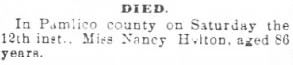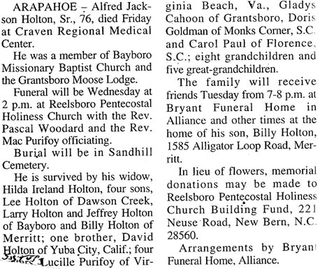 MONCKS CORNER, SC - David A. Holton, Sr., 66, formerly of Reelsboro, died Sunday, May 11 at his home. A funeral service has been scheduled for Wednesday, May 14, 11 am, at Reelsboro Pentecostal Holiness Church with burial in Sandhill Cemetery. He is survived by one son, David A. Holton, Jr. of Moncks Corner; two daughters, Lynette Staton and Tami L. Holton, both of Monck’s Corner; four sisters, Gladys Cahoon of Grantsboro, Lucille Purifoy of Virginia Beach, VA, Doris Goldman of Cordesville, SC and Carol Paul of Florence, SC; four grandchildren; and one great-grandchild. Arrangements by Bryant Funeral Home in Alliance. (The Pamlico News [Oriental, NC] - May 2003)