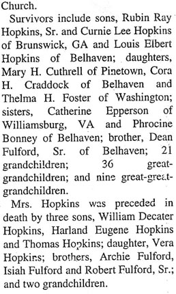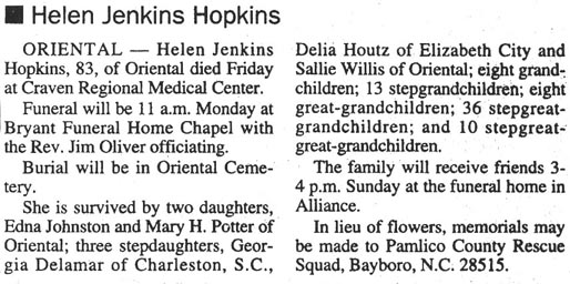 Earl Heber Hopkins, 87, died Tuesday, Aug. 30, 2011, at Grantsbrook Nursing & Rehabilitation Center. He was a master carpenter. He was an Army WWII veteran and was a member of Bayboro Masonic Lodge No. 331. He is survived by two sons, Glenn Hopkins of Cash Corner and Jay A. Hopkins of Chattanooga, Tenn.; one step-daughter, Colleen Nelson of Abilene, Texas; one brother, Lonnie Hopkins of New Bern; five grandchildren; and one great-grandchild. His funeral will be held 2 p.m., Sunday, Sept. 4, at Bryant Funeral Home Chapel with the Rev. Phillip Lewis officiating. The family will receive friends immediately following the service at the funeral home. Arrangements are by Bryant Funeral Home & Cremations, Alliance. (Sun Journal [New Bern, NC] – Saturday, September 3, 2011)Hattie Fulford Hopkins