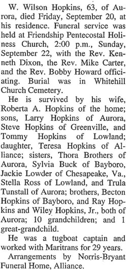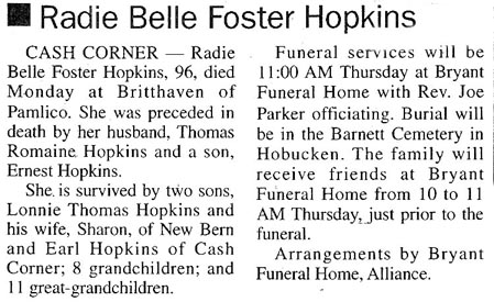 ALLIANCE - Becton Edward Hopkins Sr., 71, died Dec. 28, 2010, at CarolinaEast Medical Center. He is survived by his wife, Carrie Ellen "Khaki" Hopkins of the home; two sons, Gregory Michael Hopkins of Alliance and Becton Edward "Ed" Hopkins Jr. of Grantsboro; one brother, Wiley "Bud" Hopkins of Aurora; five sisters, Thora Brothers of Aurora, Jackie Lowder of New Bern, Stella Ross of Lowland, Sylvia Buck of Bayboro and Trula Tunstall of Edward; four grandchildren; and one great-grandchild. A funeral service will be held at 2 p.m. Friday at Bryant Funeral Home Chapel, with the Rev. Penny Dollar Farmer officiating. Internment will follow at Gatlin Family Cemetery. The family will receive friends from 6:30 to 8 p.m. tonight at Bryant Funeral Home and at other times at the home, 189 Ireland Road, Alliance. Arrangements are by Bryant Funeral Home & Cremations, Alliance. (Sun Journal [New Bern, NC] – Thursday, December 30, 2010)Dollie H. Hopkins