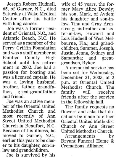 Mary Alice Dowdy Hudnell, 65, of Garner, died Tuesday at Rex Hospital after her battle with cancer. Mary Alice was a former resident of Oriental and Atlantic Beach. She was a retired staff member from Pamlico County High School. Mary Alice had a passion for the water, boating and painting. She was a loving wife, mother, sister, grandmother (known as GrandMary), great-grandmother and friend. Mary Alice was an active member of Oriental United Methodist Church and most recently of Ann Street United Methodist Church in Beaufort, N.C. Because of her illness, she moved to Garner earlier this year to be closer to her daughter, son-in-law and grandchildren. She was married for 45 years to Joe Hudnell, who preceded her in death. Mary Alice is survived by her son, Mark Hudnell of Ayden; her daughter and son-in-law, Tina and Gray Armstrong; her sister and brother-in-law, Shirley and Bruce Morris of Mesic; grandchildren, Summer, Joseph, Justin, Jenna, Sydney and Samantha; and great-grandson, Ryker. A memorial service has been set for Friday, February 17, 2006, at 11 a.m. at Oriental United Methodist Church. The family will receive friends after the service in the fellowship hall. Arrangements by Bryant Funeral Home & Cremations, Alliance. (Sun Journal [New Bern, NC] - February 16, 2006)