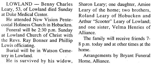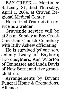 BAYBORO - William Wade Leary, 71, went to be with the Lord, Wednesday, Aug. 15, 2007, at Craven Regional Medical Center. Born June 25, 1936, he was a native of Lowland, He had been a Navy man, a boilermaker and a security guard, and retired in 1998. He was preceded in death by his parents, Hugh and Hazel Leary, son, Jack, and nephew C.B. He is survived by his loving daughter, Cynthia Sawyer of New Bern; granddaughter, Crystal Ludvigsen and husband, Daniel, of Merritt; three sisters, Mary A. Spain of Palm Beach, Fla., Faye May of Princeton, W.Va., and Saundra Futrell and husband, Clydem of Nags Head; former wife, Shirley Kennedy of Concord, and many nieces and nephews. He will be greatly missed by his family and many, many friends. He was loved by all who met him. The funeral will be at 2 p.m. Saturday at Bryant Funeral Home Chapel with the Rev. Dwayne Boyd officiating. Burial will be in New Bethlehem Free Will Baptist Church Cemetery. The family will receive friends at Bryant Funeral Home from 7 to 8 p.m. Friday. (Sun Journal [New Bern, NC] - Wednesday, August 15, 2007)
