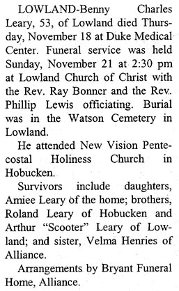 Iola I. Leary, 77, of Lowland died peacefully Tuesday at her home. Born in Lowland, she was the daughter of the late Catherine and Freeman E. Ireland. She was a loving wife and mother; devoted grandmother and special friend. She was lovingly known as "Granny" to many. She dearly loved her grandchildren and great grandchildren. She was always admired for her sweet spirit and loving kindness. She was a faithful member of Warden's Grove Free Will Baptist Church in Lowland for many years, serving as teacher and treasurer, as well as a member of the Women's Auxiliary. She loved the Lord and her church family. Funeral services will be held at 11 a.m. Saturday, February 14, 2009, at Warden's Grove Church with the Rev. Swade Benson, the Rev. Earl Sadler and Brother John Carawan officiating. Burial will follow in the church cemetery. The family will receive friends from 7 to 8:30 p.m. Friday night, February 13, at Bryant Funeral Home in Alliance or at the residence, 4361 Lowland Road, at other times. She was preceded in death by her husband, James Elwood Leary. She is survived by three sons; Michael E. Leary and his wife, Nancy, Steven E. Leary, and his wife, Pattie, and Timothy J. Leary, all of Lowland; four grandchildren, Nanda Leary Perry and her husband, Jason, of Washington, Bryan Michael Leary of Greenville, Ashley Carol Leary and Autumn Kendyl Leary, both of Wilmington; two great-grandchildren, Matthew and Brenna Perry of Washington; one sister, Ramona Willis of Arapahoe; and two brothers, Dolan Ireland of New Bern and Zool Ireland of Lowland. In addition to her parents and husband, she was preceded in death by a brother, Bennie Ireland. Special thanks from the family to Community Home Care and Hospice, and to her very dear caregivers for their devoted assistance during her illness. Arrangements by Bryant Funeral Home and Cremations, Alliance. (Sun Journal [New Bern, NC] – Sunday, February 15, 2009)
