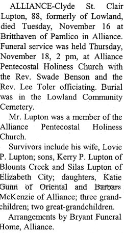Clifton Paul Lupton, Sr., 91, of Hobucken, passed away Wednesday, April 19, 2017 at CarolinaEast Medical Center. He was a commercial fisherman most of his life. He is preceded in death by his wife, Ruby Lupton, son Jerry Wayne Lupton, brothers, Earl Lupton and Forrest Lupton and sisters, Lucy Guthrie and Beulah Bruce. He is survived by one son, Paul Lupton (Cathy); one daughter Pat Armstrong; one brother, Jasper Lupton; two sisters, Elizabeth Campen and Helene Glazebrook; five grandchildren, 12 great grandchildren and 3 great great grandchildren. His funeral service will be held at 11 a.m. Friday, April 21, 2017 at Bryant Funeral Home Chapel with the Rev. Phillip Lewis officiating. The family will receive friends one hour prior to the service at the funeral home. Arrangements by Bryant Funeral Home & Crematory, Allliance, NC. (Sun Journal [New Bern, NC] - Thursday, April 20. 2017)