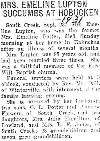 She married 1st: Tilmon Farrow Flowers in 1872; 2nd: Samuel Eason Potter in 1878; 3rd: Andrew Jackson Lupton in 1924