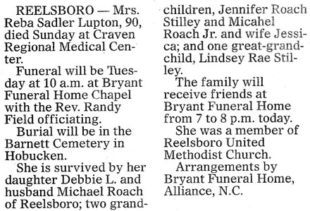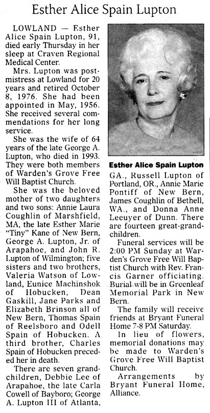 LOWLAND - Letha Mae Lupton, 86, died Sunday, March 27, 2005 at Craven Regional Medical Center. A funeral service is planned for Tuesday, 2 pm, at Warden's Grove Free Will Baptist Church, where she was a member, with burial in Lowland Community Cemetery. She is survived by one son, Dennis Spoon of Brandon, FL; three daughers, Carolyn Willis of Glenburnie, MD, Donna Bennett of Grantsboro and Sharlene Leary of Lowland; six grandchildren; 12 great-grandchildren; and one great-great-grandchild. Arrangements by Bryant Funeral Home & Cremations, Alliance. (The Pamlico News [Oriental, NC] - April 2005)