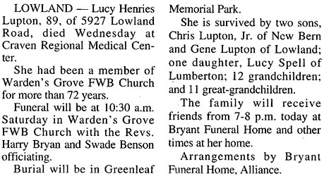 Lovie Spence Lupton, 73, of Cooper Road, Alliance, died at home on Feb. 8, 2009. She was a member of Warden's Grove Free Will Baptist Church in Lowland. She is survived by one daughter, Barbara McKenzie of Alliance; one sister, Pauline Midyette of Bayboro; two grandchildren; and six great-grandchildren. A graveside service will be held at 11 a.m. Wednesday, Feb. 11, at the Lowland Community Cemetery with Connie Mitchell officiating. The family will receive friends from 7 to 8 p.m. Tuesday at the home, 337 Cooper Road, Alliance. Arrangements by Bryant Funeral Home and Cremation, Alliance. (Sun Journal [New Bern, NC] – Tuesday, February 10, 2009)