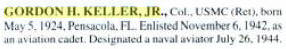 (May 5, 1924 - December 4, 2013)Col. Gordon H. Keller, Jr., USMC, Retired, 89, of Minnesott Beach died Wednesday, December 4, 2013, at home. After retiring from the U.S. Marine Corps with twenty-eight years of service as an aviator, he founded Indian Trace Company and then became owner and operator of Keller Construction. He was one of the first developers of Minnesott Beach. He was preceded in death by his wife, Peggy Keller. He is survived by his daughter, Susan Keller of Minnesott Beach and her children, Scott Taylor (children, Chance & Charley) Erik Taylor (children, Joshua & Abby), Summer Keller and Gerry Keller; his son, Robert S. Keller and wife, Stacy of Oriental and their children, Kevin Peacock, Angie Toler (child, Jacob), Robert Keller, Jr. (children, Anthony & Sean), Michelle Jones (child – Ryder) Alex Keller and Danielle Krob (children, Donovan & T.J.); three brothers, Carroll R. Keller of Birmingham, Ala, Franklin M. Keller of Oriental, and Walter S. Keller of Huntsville, Ala. His memorial service with military honors will be held 11:00 a.m., Saturday, December 7th at Arapahoe United Methodist Church with the Rev. Penny Dollar Farmer officiating. (Bryant Funeral Home)