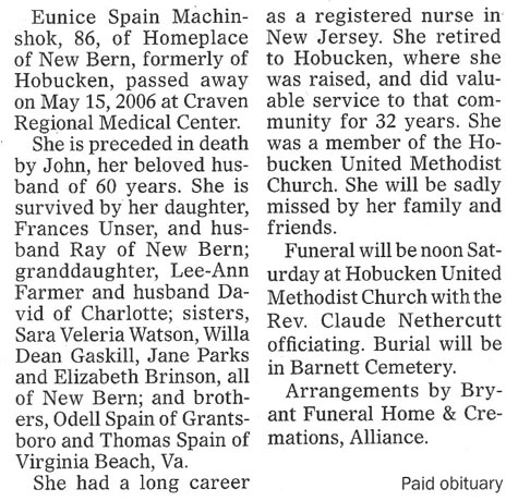 HOBUCKEN - John F. Machinshok, 92, of Hobucken died Tuesday, May 13 at Britthaven of Pamlico. A funeral service was held Thursday, May 15, 11 am, at Hobucken United Methodist Church with the Rev. Claude Nethercutt officiating. Burial was in Barnett Cemetery. He was a member of Hobucken United Methodist Church and served in WWII in the Army. He retired from the state of New Jersey. He is survived by his wife, Eunice Machinshok; one daughter, Frances Unser of New Bern; one brother, Frank Machinshok of Dover, NJ; two sisters, Josephine Proskie of Morristown, NJ and Marge Chovenec of NJ; and one grandchild. Arrangements by Bryant Funeral Home in Alliance. (Pamlico News [Oriental, NC] - May 2003)
