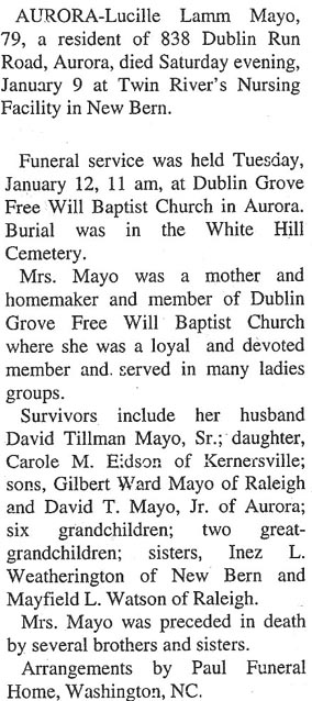 GRANTSBORO - Sina Josephine Mayo, 85, of 185 Hwy. 306 S., died Monday, January 2, 2006 at Craven Regional medical Center. She was a faithful member of rock of Zion Free Will Baptist Church. She and her husband owned Mayo's Variety Store in Bayboro for 18 years. Mama Mayo, as she was known to her family, was an honorable woman who dedicated her life and time to serving the Lord and raising her family. She put her family before anything else and was always willing to give to anyone less fortunate. Anyone who knew "Mama Mayo" loved her for her kindness and love for people. She was preceded in death by her parents, Norman and Dell Willis and her brother, Lockwood Willis. She is survived by her husband of 65 years, Kermit Mayo; one daughter, Janice and husband, Jim Taylor, of Grantsboro; three granddaughters, Teresa of Grantsboro, Tammy and husband, Brooks Broughton, of Oriental, and Ginger and husband, Chip Dickinson, of Grantsboro; four great-grandchildren, Tiffany Scott, Amanda and Brandon Broughton and Dale Dickinson; two brothers, Lloyd Willis and Morris Willis; and one sister, Bonnie Mae Humphrey. A funeral service was held Thursday, January 5 at 11:00 am at Bryant Funeral Home Chapel with the Rev. Michael Bryan and the Rev. Lee Toler officiating. Burial was in Paul Cemetery. The family received friends at Bryant Funeral Home on Wednesday prior to Thursday's funeral from 7:00 pm until 8:30 pm and other times at her home. Arrangements by Bryant Funeral Home and Cremations, Alliance. (The Pamlico News [Oriental, NC] - January 2006)