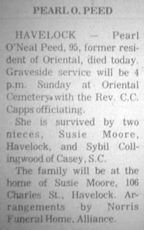 NEW BERN - Emma Hodges Pearsall, 66, 2915 Brunswick Ave. died Friday, Oct. 15, 2010, at Carebridge Assisted Living Center. She was a native of Pamlico County and was a retired homemaker. Memorial services will be conducted 2 p.m. Thursday at St. Stephen M. B. Church on Janiero Road in Oriental with the revs. Serinus Willis and Marcus Burton officiating. Burial will be in the St. Stephen Church Cemetery. She is survived by her daughter, Valerie Holder of Raleigh; son, Anthony Hodges of New Bern; two brothers, Rev. Claude Davis of Oriental and Charlie Hodges of Brooklyn, N.Y.; three sisters, Margaret Lovick of Oriental, Mary Smith of Alliance, Algertha Smith of Oriental; and five grandchildren, and one great grandchild. The family will receive friends at the residence of Mary Smith 341 Halls Creek Road, Reelsboro. Viewing will be Wednesday from 9:30 a.m. to 6 p.m. at Oscar's Mortuary. (Sun Journal [New Bern, NC] – October 21, 2010)Ervin Earl Peed, Sr.