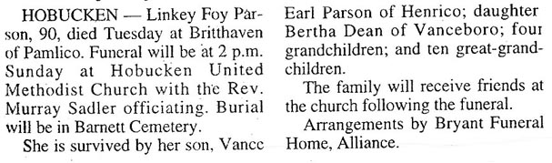 Willie Murfie Parson, 88, died Friday. He was a retired commercial fisherman. Funeral 2 pm Sunday from Hobucken United Methodist Church with the Rev. John W. Wenberg and the Rev. Billy Twiddy. Burial in the Barnett Cemetery. He is survived by his wife Mrs. Louisa Spain Parson; one son Roosevelt Earl Parson, Hobucken; 3 grandchildren and 7 great-grand children. The body will remain at the Pollock-Lineberry Funeral Home until 12 noon Sunday. (unknown newspaper & date) [Kindly submitted by Jan Orndorff who gave the following information: William Murphy Parson, born 31 May 1886 Pamlico Co., NC; died 4 Apr 1976, Hobucken, Pamlico Co., NC; son of Richard Thomas Parson & Annie Ireland]