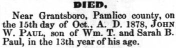 NEW BERN - Michael Anthony Paul, 26, of New Bern died Friday, April 7, 2006 at Craven Regional Medical Center. He was a member of the Professional Bowlers Associates and he enjoyed fishing and hunting. The funeral was held at 11:00 a.m. on Tuesday, April 11 2006 graveside at Paul Cemetery in Grantsboro with Reverends Bill Wingard, Lee Toler, and Reverend Dwight Williams. He is survived by his wife Sheryl B. Paul and his children, one son, Gabriel Paul and one daughter, Katherine Paul all of the home. He is also survived by his brother Mark Paul of Grantsboro, his paternal grandfather James Nobles of Alliance, and his parents Phillip and Virginia Paul of Grantsboro. The family received friends Monday, April 10 from 6 p.m. until 8 p.m. at Bryant Funeral Home in Grantsboro. (Pamlico News [Oriental, NC] - April 9, 2006)