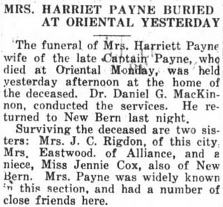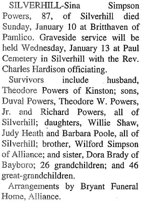 GRANTSBORO - Pauline H. Powers, 90, of Grantsboro, died Friday, September 30 at Craven Regional Medical Center. A funeral service was held Monday, October 3, 11 am, at Silverhill Christian Church with the Rev. Amos Sykes officiating. Burial was in Paul Cemetery in Silverhill. She was a member of Silverhill Christian Church. She is survived by two sons, Robert L. Powers of New Orleans and Jimmie B. Powers of Chesapeake, VA; two daughters, Selma Rowe of Bayboro and Susan Allenbaugh of Jonesboro, GA; seven grandchildren; nine great-grandchildren; and one great-great-grandchild. Arrangements by Bryant Funeral Home and Cremations, Alliance. (The Pamlico News [Oriental, NC] - October 3, 2005)